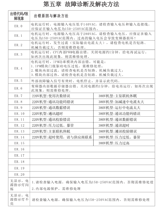 ER.0 :電機運行時,電源輸入電壓低于140VAC,請檢查輸入電壓和輸入連接線應保證在輸入電壓為150-250VAC范圍內(nèi)。