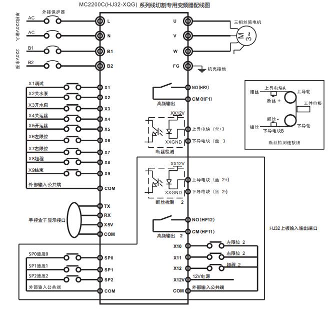 MC2200C /HJ32、MC3300/HJ33 線切割專用變頻器是我司針對線切割機(jī)床市場推出的一系列專用變頻器,集成了傳統(tǒng)通用變頻器功能+PLC(單片機(jī)控制)功能+外置手控盒功能;使用我司MC2200C/HJ32、MC3300/HJ33 系列線切割專用變頻器只需將外部信號直接接入相對應(yīng)端口即可實(shí)現(xiàn)所有控制,與通用變頻器相比省去眾多不必要的參數(shù)設(shè)置,安裝接線使用更簡單方便。